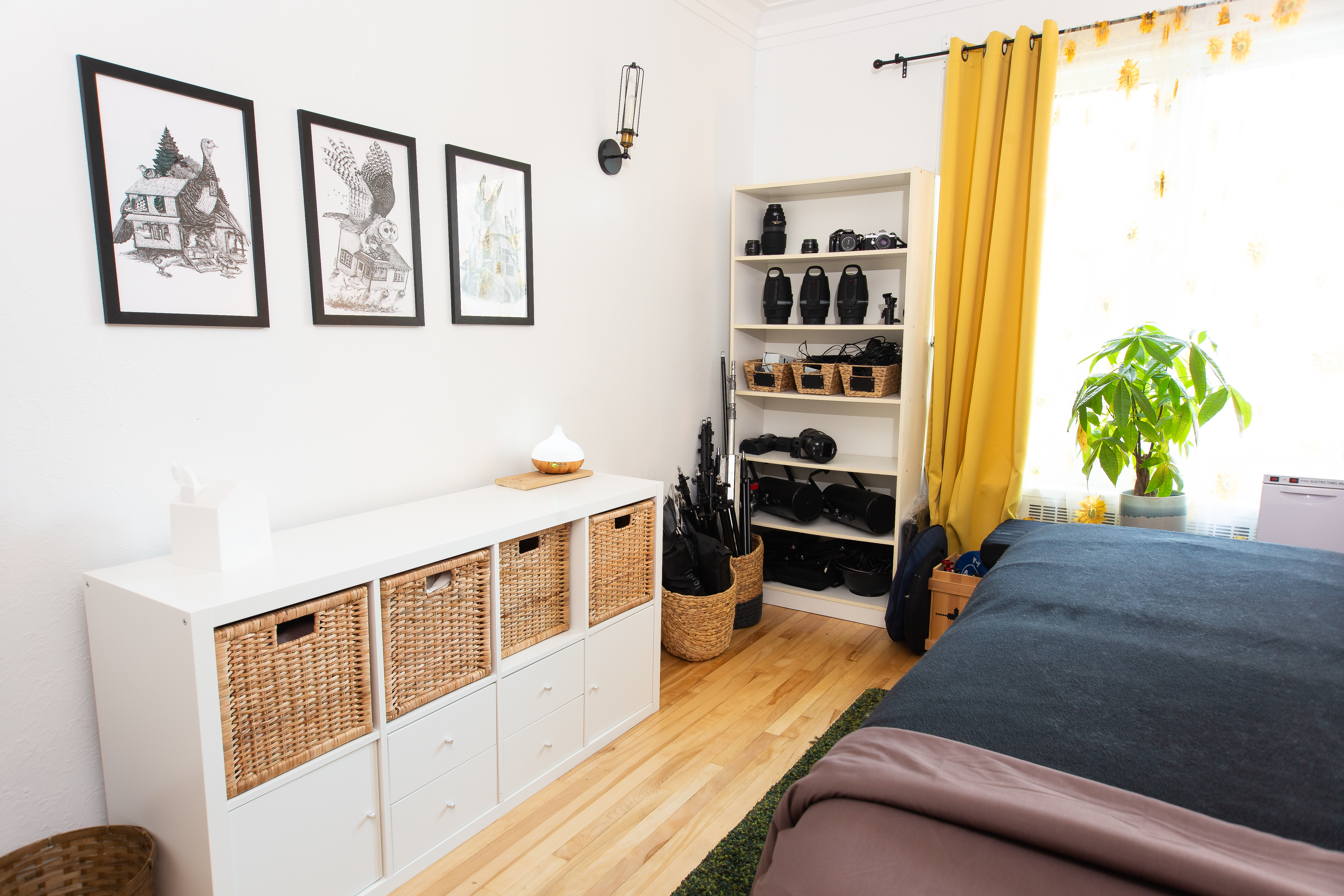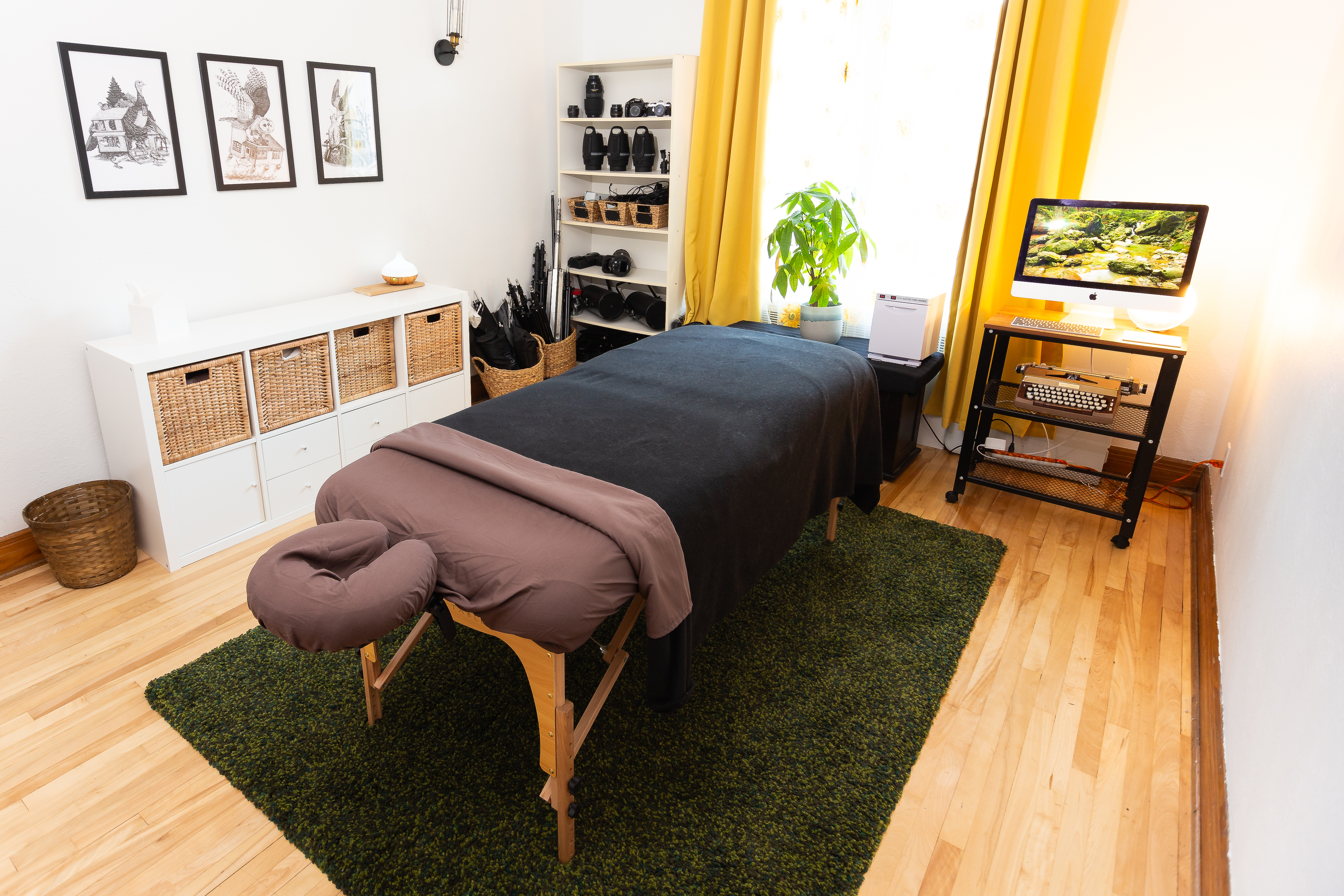 Gabriel accueille sa clientèle dans son studio. Dédiée à la massothérapie et à la photographie, la pièce invite à la création et à la méditation.